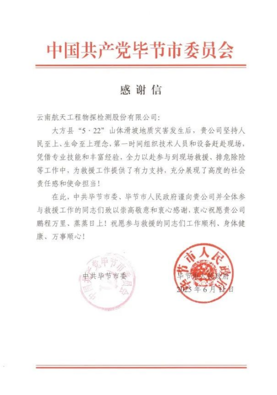 近期,OK138太阳集团收到了来自中共毕节市委、毕节市人民政府的感谢信,信中表达了对OK138太阳集团在大方县“5·22”山体滑坡地质灾害救援行动中积极响应的感谢,以及对在救援行动中所开展探测工作的认可。2025年5月22日,贵州省大方县果瓦乡庆阳村突发滑坡地质灾害,十余人被困。公司于当日上午接到应急管理部紧急救援指令后迅即响应,第一时间组织拥有丰富应急救援经验的专业...